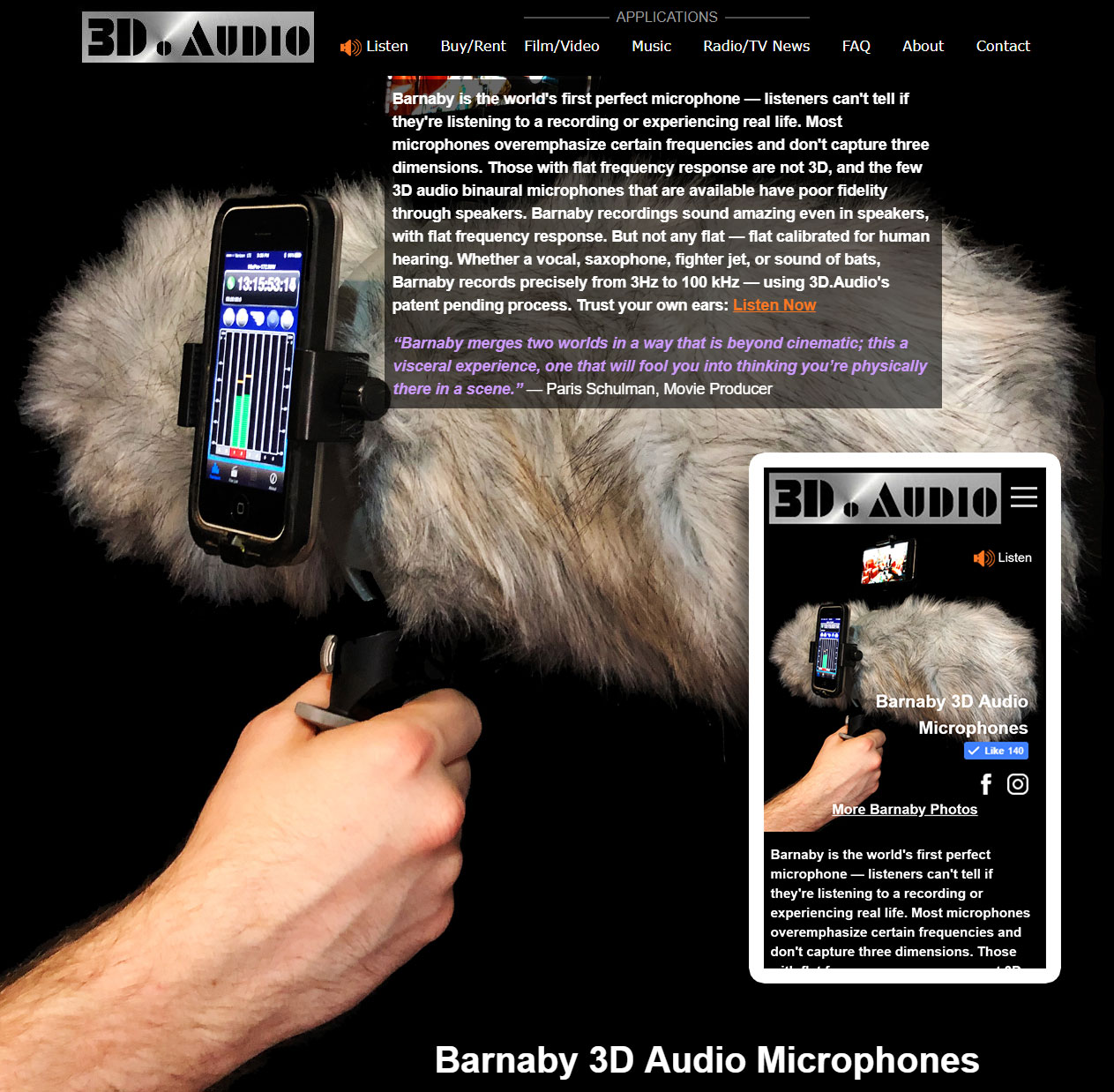 Website offering specialized '3D sound' microphones for purchase or rental for use in music, film and media production. Built from scratch under the direction of the organization owner. Includes an internal shopping cart that integrates with Paypal and Soundcloud API integration.